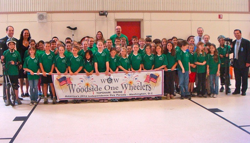 The unicycle group is made up of 80 local students from the Woodside Elementary School in Topsham. They recently performed during the Brunswick-Topsham Memorial Day parade, as well as during a Maine Red Claws halftime show.
